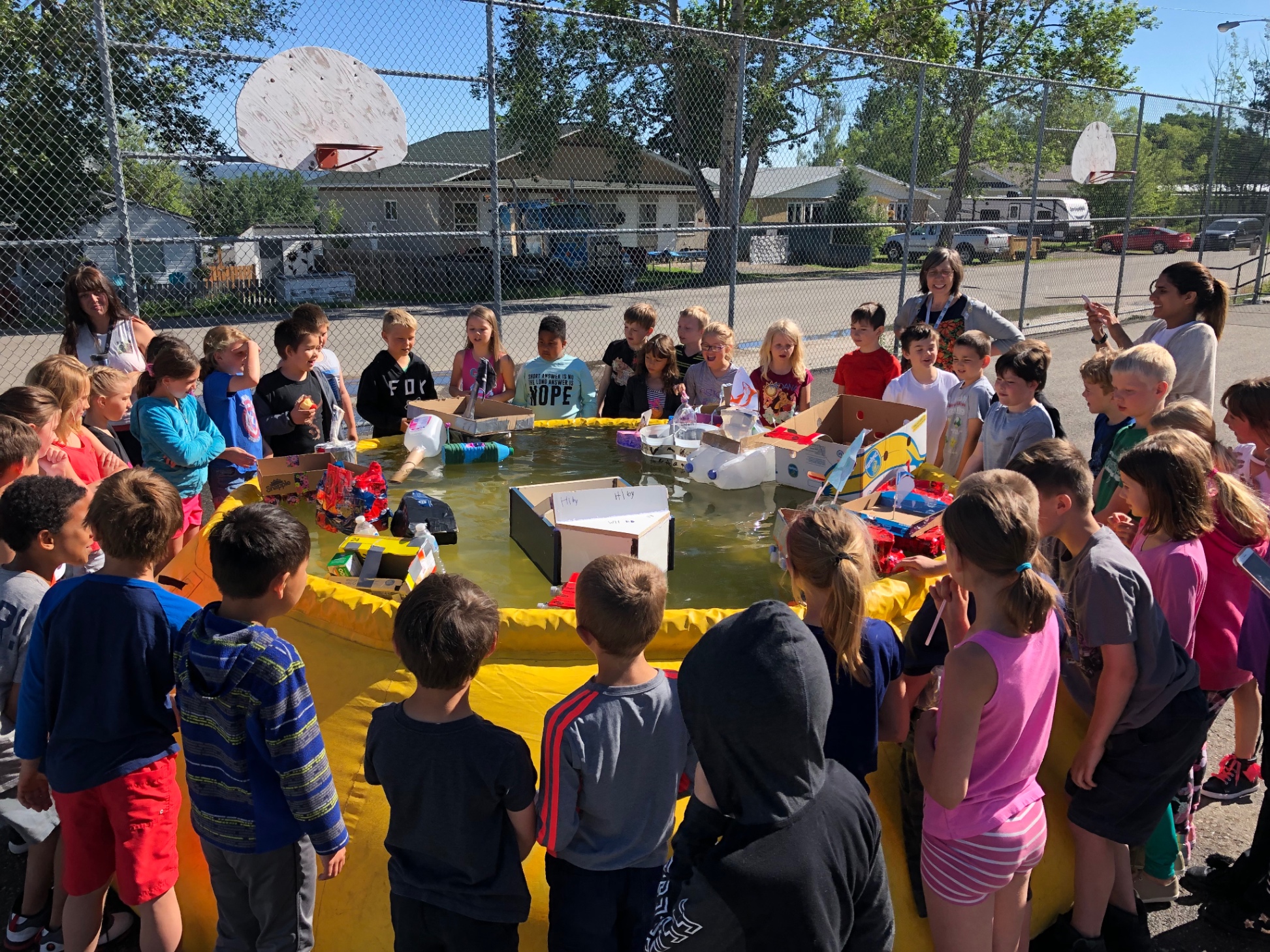 Students working collaboratively utilize cardboard and adhesives to design and construct a small boat – the boat with passenger is floated inside a water bladder to determined how long it can remain afloat.